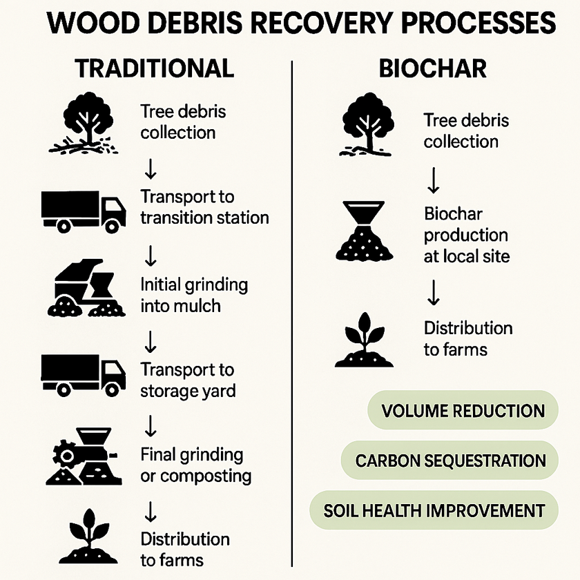 Because biochar is lightweight and high-value, it can be sold beyond the local region, turning storm debris into an economic opportunity.